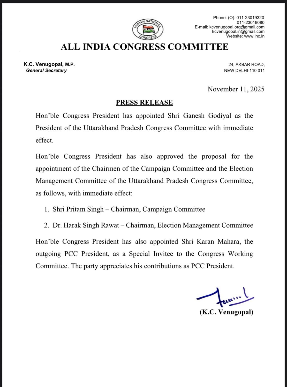 Pure Politics: कांग्रेस के राष्ट्रीय नेतृत्व ने बड़ा फ़ैसला लेते हुए उत्तराखंड विधानसभा चुनाव 2027 के लिए गणेश गोदियाल को प्रदेश अध्यक्ष नियुक्त कर दिया है। साथ ही पूर्व प्रदेश अध्यक्ष प्रीतम सिंह को कैंपेन कमेटी का अध्यक्ष और डॉ हरक सिंह रावत को इलेक्शन मैनेजमेंट कमेटी का चेयरमैन नियुक्त कर दिया है। निवर्तमान अध्यक्ष करन माहरा को कांग्रेस कार्य समिति में विशेष आमंत्रित सदस्य बनाया गया है।