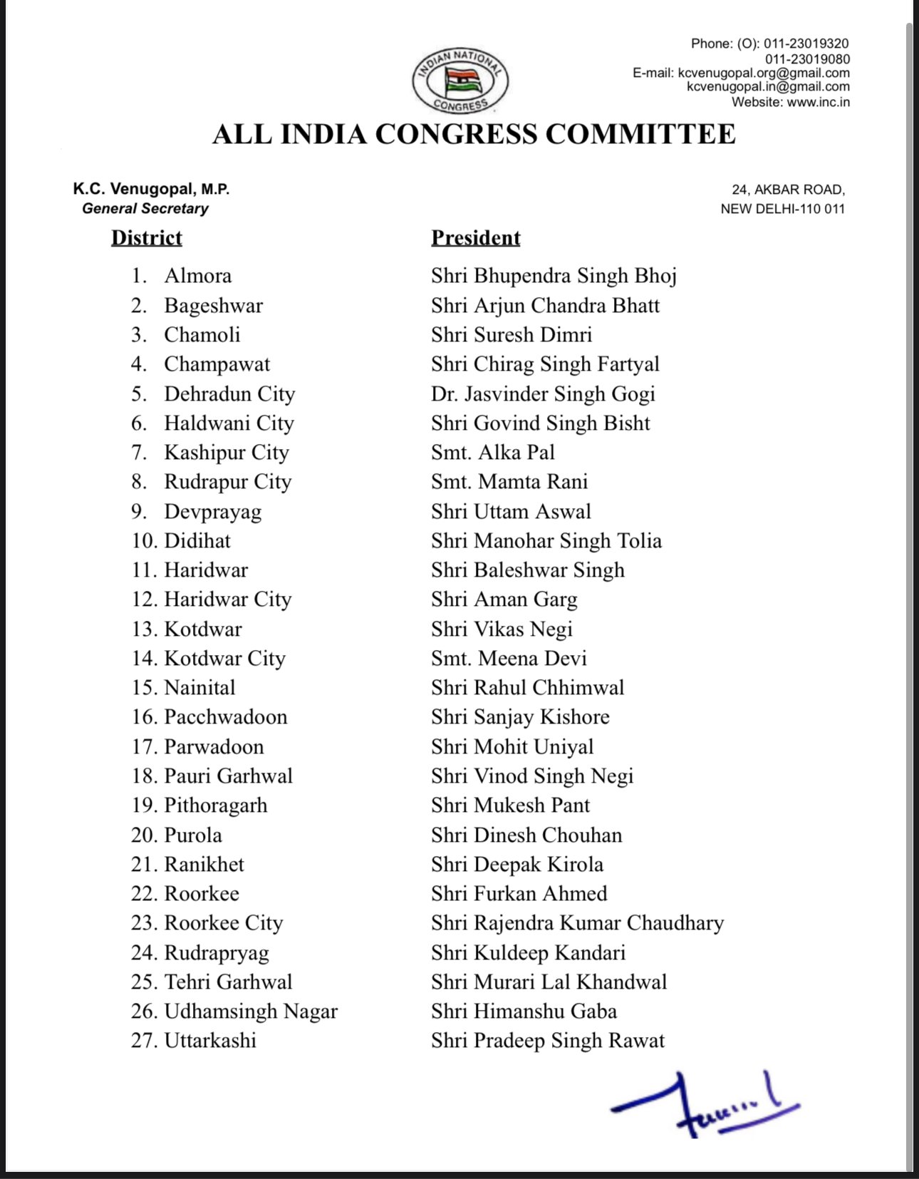 इसी के साथ कांग्रेस ने उत्तराखंड के 27 सांगठनिक जिलों के लिए नए जिलाध्यक्षों की भी नियुक्ति कर दी है। यह अभूतपूर्व है कि कांग्रेस ने उत्तराखंड में विधानसभा चुनाव से सवा साल पहले ही प्रदेश अध्यक्ष, कैंपेन कमेटी चीफ से लेकर चुनाव प्रबंधन समिति हेड का एलान कर दिया है।